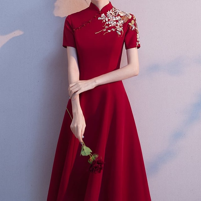 ドレス チャイナドレス ミモレ丈 膝丈 ワンピース 披露宴 二次会 発表会 華やか 大きいサイズ 着やせ ピアノ 演奏会 エレガント 刺繍 お呼ばれ 可愛い 半袖 パーティドレス コスチューム 大人