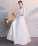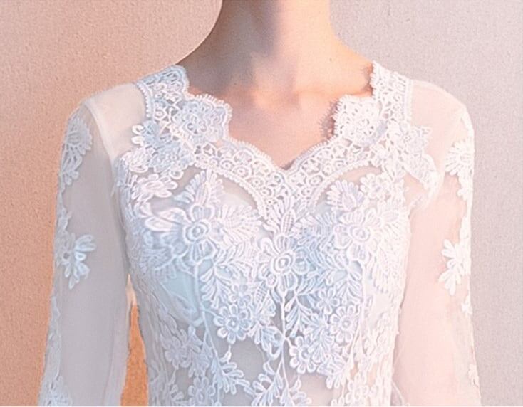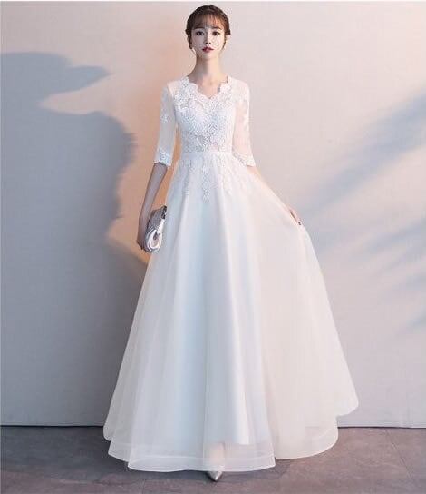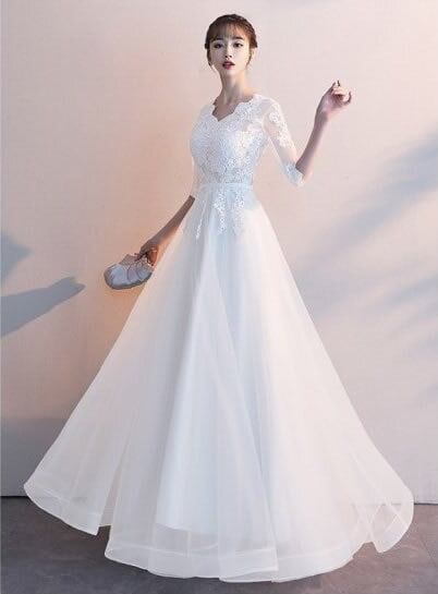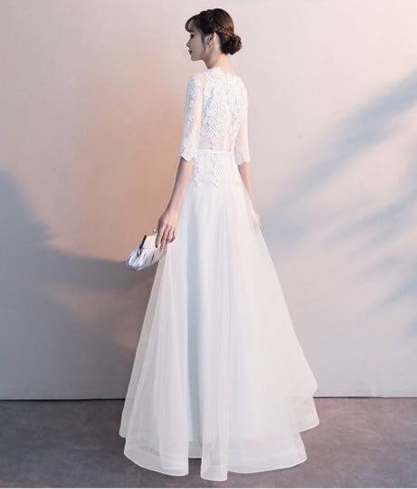 ドレス イブニングドレス ウエディングドレス ホワイト Aライン レース 袖あり 5分丈 ロングドレス 大きいサイズ きれいめ ウエストマーク 透け感 大人 チュールスカート パーティー 二次会