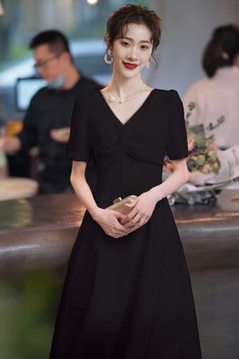 ドレス 膝丈 ブラック イブニングドレス シンプル Vネック フォーマル 大きいサイズ 半袖 無地 着痩せ スタイルアップ 結婚式 二次会 パーティー 大人可愛い セクシー フレアスカート きれいめ