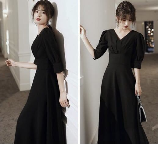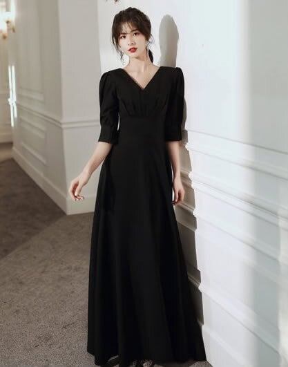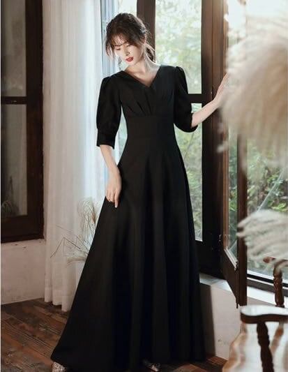 ドレス イブニングドレス ブラック ロングドレス パフスリーブ 大きいサイズ Vネック フォーマル 無地 シンプル 着痩せ 二次会 結婚式 お呼ばれ スタイルアップ 大人 可愛い 20代 30代