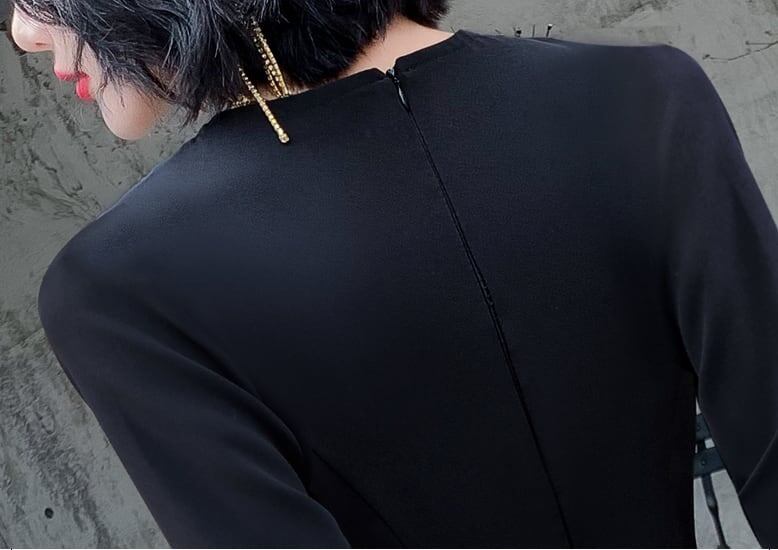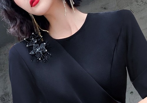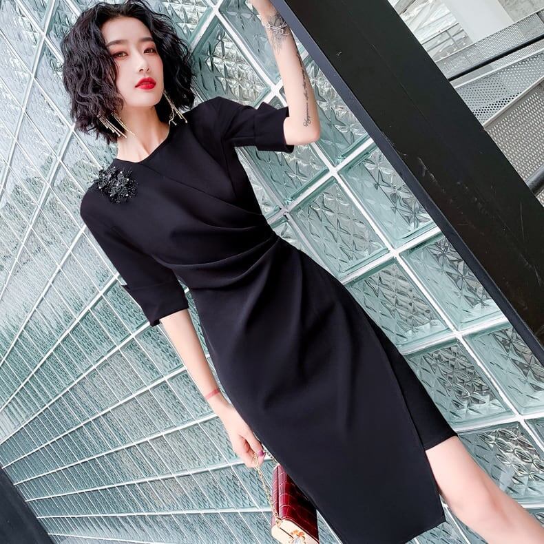 ドレス ワンピース 膝丈 モエレ丈 ブラック 無地 シンプル 大きいサイズ ウエストマーク レディース 5分丈 アシンメトリー タイト 着痩せ きれいめ 大人 パーティー お呼ばれ 二次会 韓国風