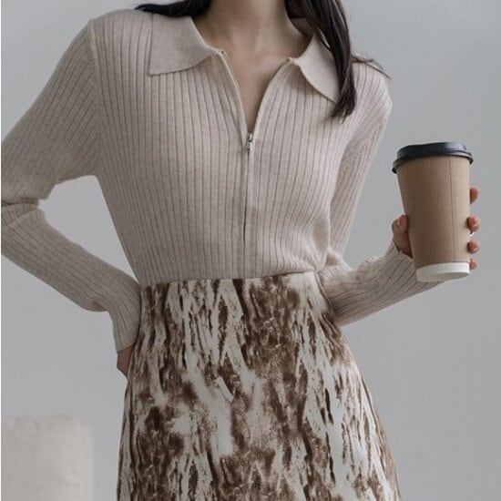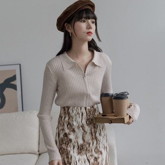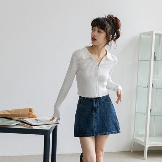 ニットトップス ジップアップ リブニット 長袖 ショート丈 ポロカラー ファスナー トップス 細リブ 無地 タイト 細身 きれいめ 薄手 カットソー 薄手ニット 韓国 オルチャン