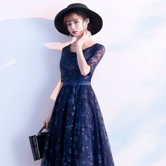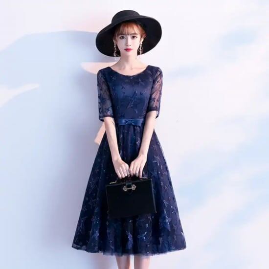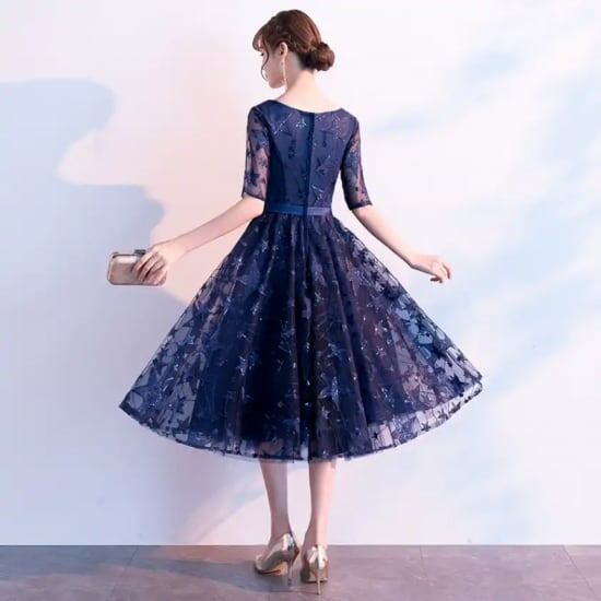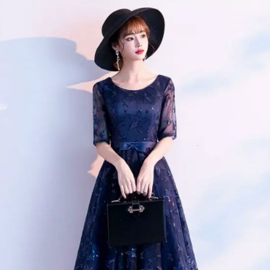 ドレス 結婚式 披露宴 二次会 フォーマル イブニングドレス ロング丈 ミディ丈 華やか エレガント パーティドレス 刺繍 五分袖 七分袖 Aライン