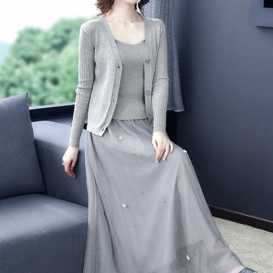 3点セット 上下セット カーディガン トップス スカート ニット シフォンスカート マキシ丈 パール 刺しゅう Vネック リブニット 上品 エレガント 大きいサイズ