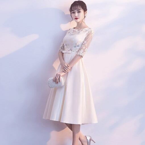 ドレス 膝丈 イブニングドレス ミドル丈 大きいサイズ レース ワンピース 花柄 透け感 ウエストマーク 可愛い 5分丈 きれいめ パーティー 二次会 結婚式 お呼ばれ お食事会 韓国風