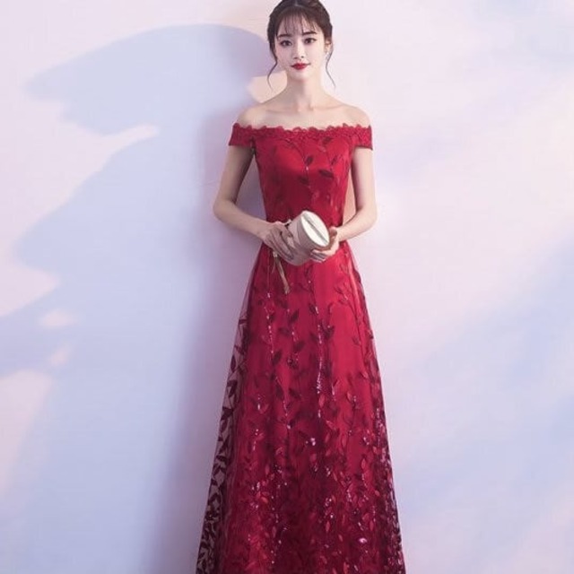 ロングドレス イブニングドレス レッド マキシ丈 オフショルダー 結婚式 韓国風 花嫁 大きいサイズ レディース キラキラ セクシー 華やか エレガント 発表会 演奏会 パーティー 編み上げ