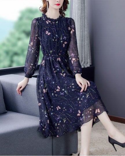 ワンピース シフォンドレス 膝丈 ミモレ丈 大きいサイズ レディース ウエストマーク 春 秋 長袖 ネイビー 花柄 蝶々柄 上品 エレガント レース 透け感 お呼ばれ 大人可愛い 20代 30代
