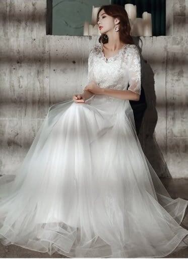 ロングドレス レース 半袖 五分袖 シースルー Vネック 上品 白 ウエディングドレス 結婚式 花嫁 演奏会 発表会 透け感 袖あり 刺しゅう 大人 シンプル 大きいサイズ
