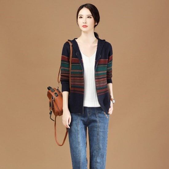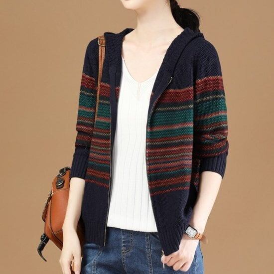 ジップアップ パーカー ニット カーディガン エスニック フード付 ファスナー 前開き レディース 秋冬 セーター ボーダー カジュアル 大人 トップス 羽織 大きいサイズ