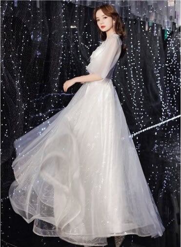 ドレス ロングドレス チュール モエレ丈 イブニングドレス ホワイト 透け感 発表会 演奏会 パーティー 可愛い きれい 7分丈 エレガント ゴージャス きらきら 上品 着痩せ 韓国風 オルチャン