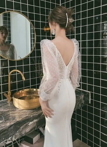 ドレス イブニングドレス ロング マキシ丈 ホワイト 大きいサイズ マーメイドドレス 後ろ開き セクシー エレガント 大人 ゴージャス 長袖 袖あり パーティー お呼ばれ 発表会 透け感 華やか