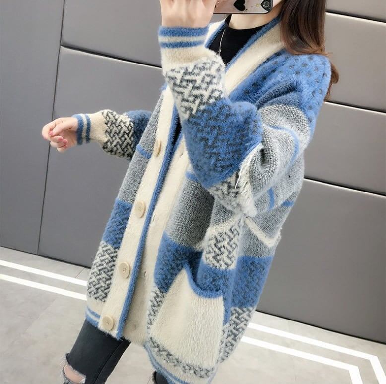 ニットカーディガン セーター 長袖 レディース秋冬 羽織 ロング 幾何学模様 カジュアル 通勤 通学 韓国 オルチャン 大きいサイズ 着やせ Vネック 前あき 防寒対策 30代 40代 ルーズフィット