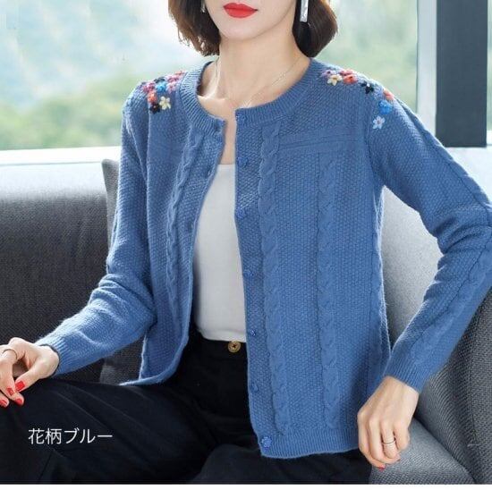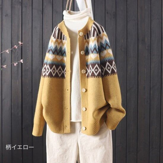 カーディガン ニット セーター アウター 長袖 エスニック ボタン 花柄 あったか ノーカラー 韓国風 トレンド 人気 可愛い カジュアル カラフル エレガント レディースファッション 20代