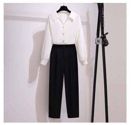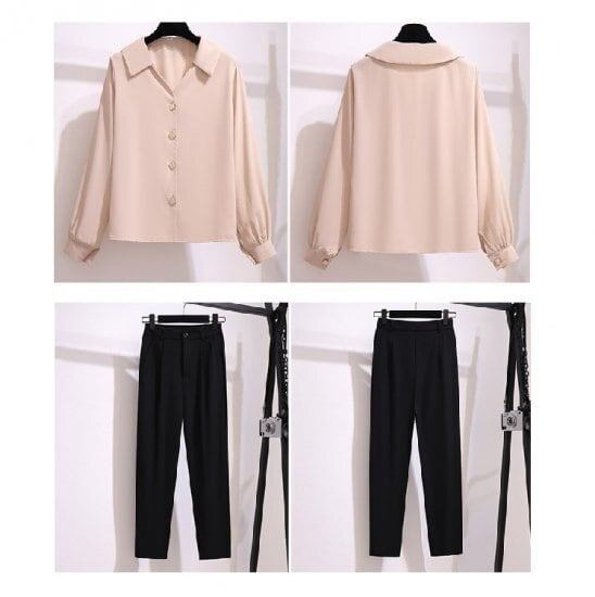 ブラウス パンツ セットアップ シャツ シフォン スラックス クロップドパンツ OL 通勤 ボタン トップス 2点セット 上下セット 長袖 Vネック 大きいサイズ オフィスカジュアル