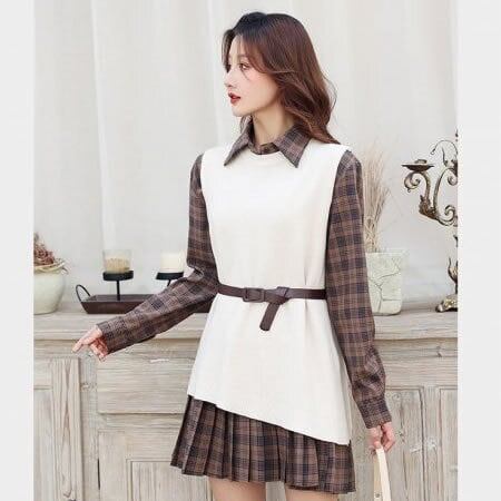 ワンピース ニットベスト チェック柄 ミニ丈 シャツワンピース セットワンピース ベルト 長袖 秋 春 プリーツスカート ブラウン レディース Aライン 10代 20代 トレンド ウエストマーク