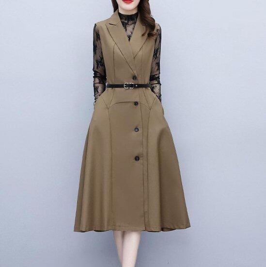 ワンピース トップス セット フォーマル レースインナー レイヤード 重ね着 ノースリーブ ジレ風 ベルト付き テーラードカラー 上品 ひざ丈 大きいサイズ Aライン 長袖 レース