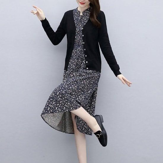 ワンピース カーディガン セット 花柄 秋 長袖 ロングワンピース ゆったり 着やせ カジュアル ロング丈 ミモレ丈 2点セット 大きいサイズ 長袖ワンピ セットアップ