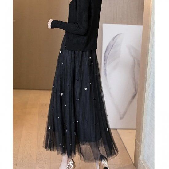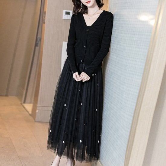 セットアップ ニット 大きいサイズ アンサンブル ロング丈 秋新作 セット 3点セット 長袖 マキシ丈 ニット リブニット シフォン スカート キャミソール カーディガン