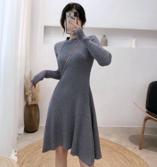 ワンピース ニットドレス レディース ガールズ カジュアル 長袖 千鳥格子 ミディ丈 ミリタリー ハイウエスト 秋冬 あたたか レトロ 襟 セーター