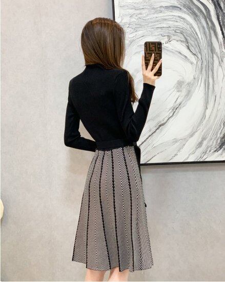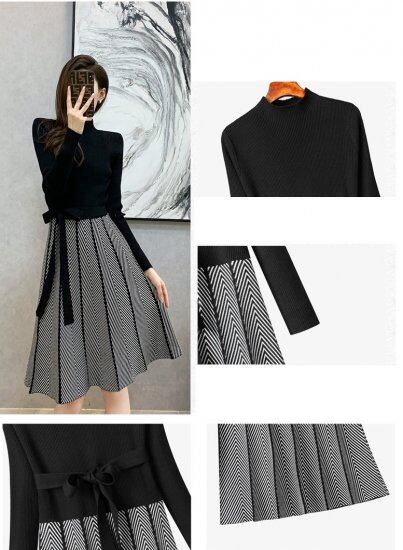 ワンピース ニットドレス レディース ガールズ カジュアル 長袖 千鳥格子 ミディ丈 ミリタリー ハイウエスト 秋冬 あたたか レトロ 襟 セーター