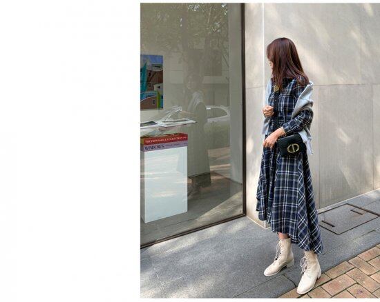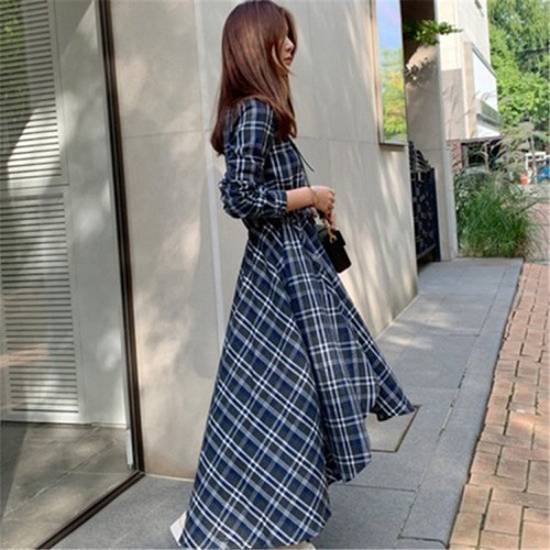 ワンピース ニットドレス レディース ガールズ カジュアル 長袖 千鳥格子 ミディ丈 ミリタリー ハイウエスト 秋冬 あたたか レトロ 襟 セーター