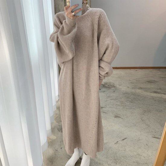 ワンピース ニットドレス レディース ガールズ エレガント 長袖 フリース あったか ミディ丈 秋冬 新作 通勤 キレイ レース ラウンドネック