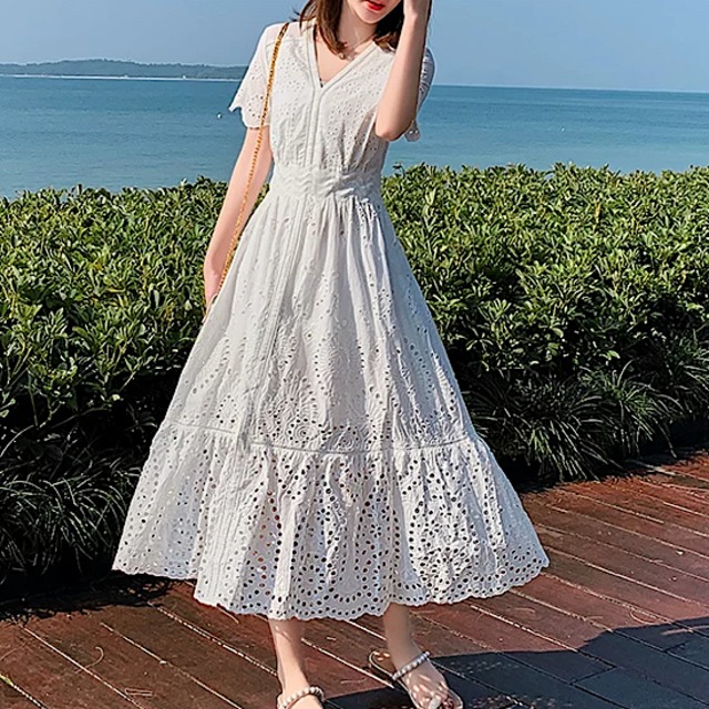 ワンピース レース 刺繍 リゾート 半袖 Vネック ミモレ丈 清楚 レディース 無地 体型カバー 夏 ゆったり 春 新作 清楚 大人スタイル スプリングウェア シースルー 海辺 休暇 旅行 スリム