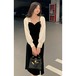 ワンピース ツートンカラー バイカラー ロング丈 ティアード 五分袖 レトロ レディース 無地 体型カバー 夏 ゆったり 新作 カジュアル 大人スタイル ルーズ スクエアネック Aライン