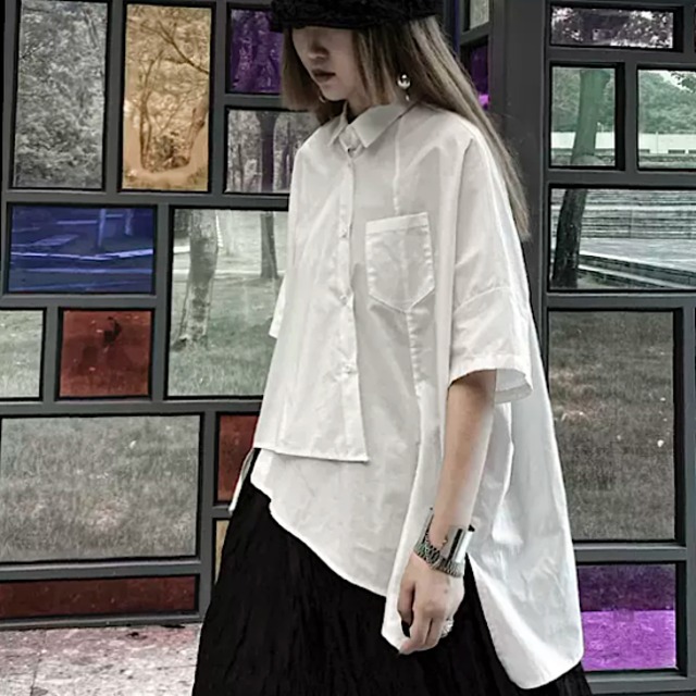 シャツ ブラウス アシンメトリー フロントボタン 半袖 無地 シャツブラウス レディース 大きいサイズ ゆったり シンプル カジュアル 大人スタイル サマー 半袖シャツ コットン ルーズ トップ