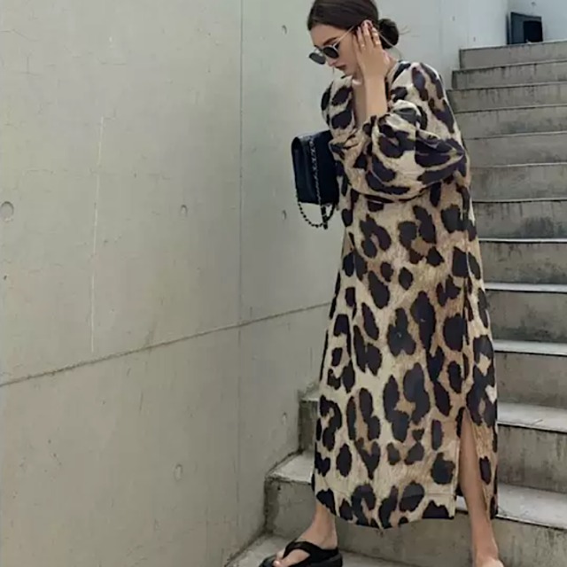 ワンピース Vネック オーバーサイズ レオパード ボックス レディース ゆったり 春 新作 清楚 カジュアル 大人スタイル スプリングウェア ロング丈 ルーズ ホリデー 長袖 レトロ 春秋