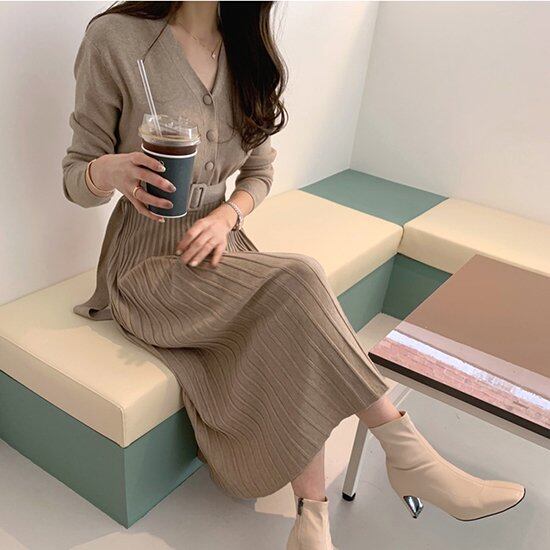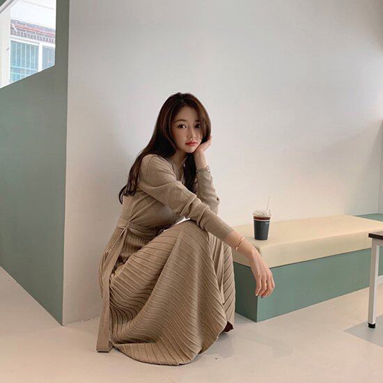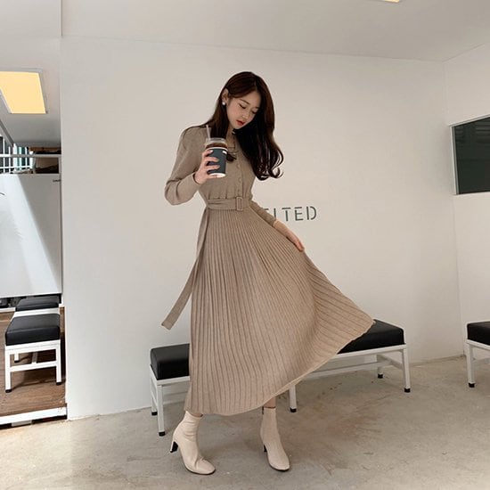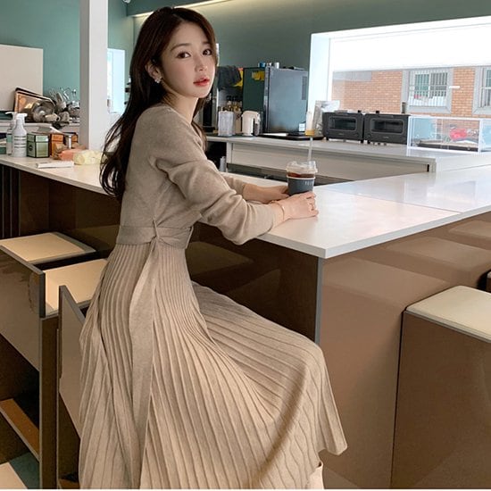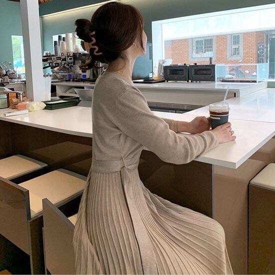 ワンピース ニットドレス レディース ガールズ エレガント 通勤 カジュアル 新作 長袖 ラウンドネック プリーツスカート フリース 秋冬 Aライン