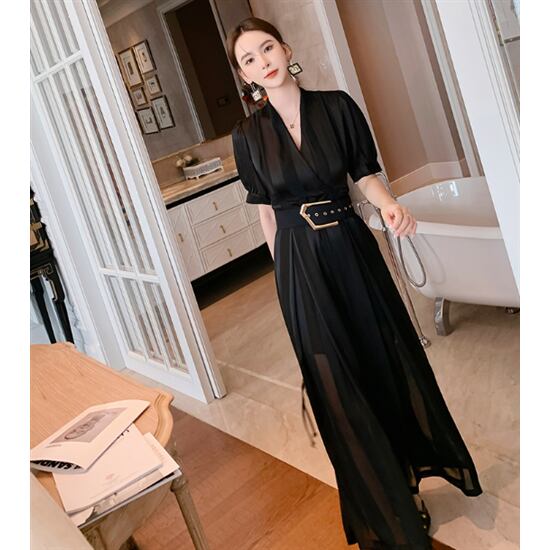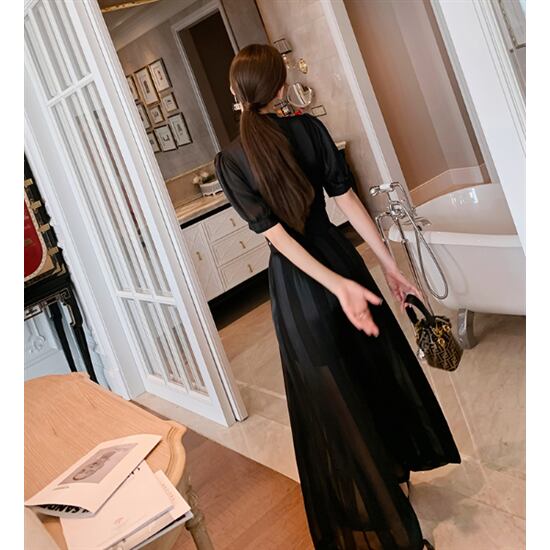 ロングワンピース レディーススカート ランタンスリーブ Vネック プルオーバー フリルスカート 大きいサイズ 長袖 シフォン エレガント おしゃれ お呼ばれ きれいめ フォーマル 花柄 スカート