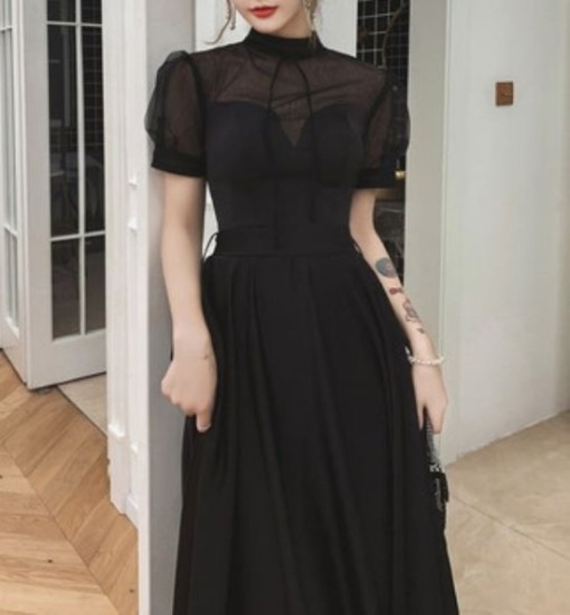 結婚式ドレス パーティードレス イブニングドレス 結婚式 二次会 謝恩会 女子会 ブラック 単色 無地 シースルー バックデザイン ロングドレス ハイネック 半袖 大きいサイズ 2XL エレガント