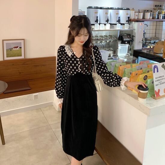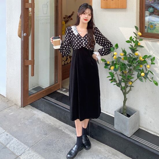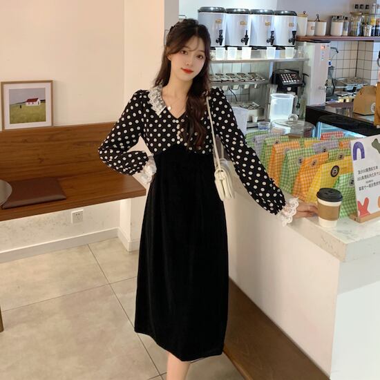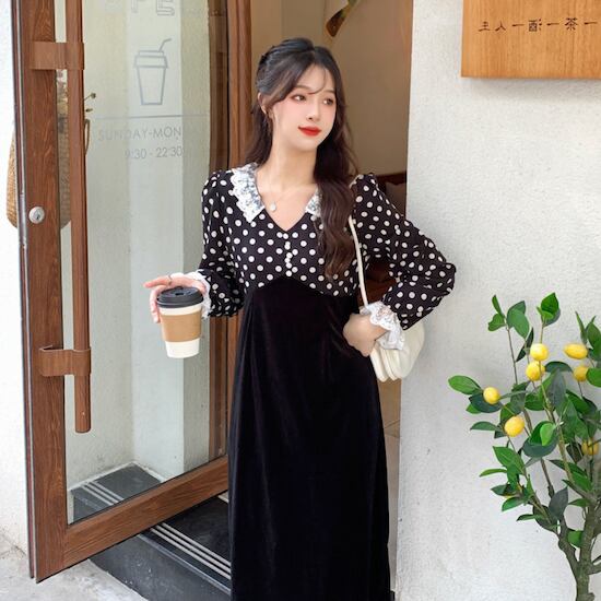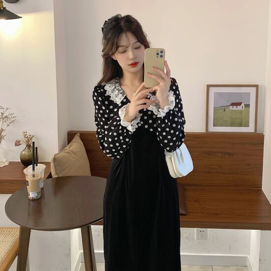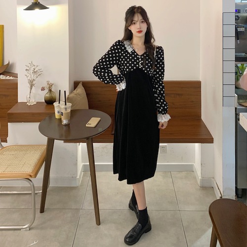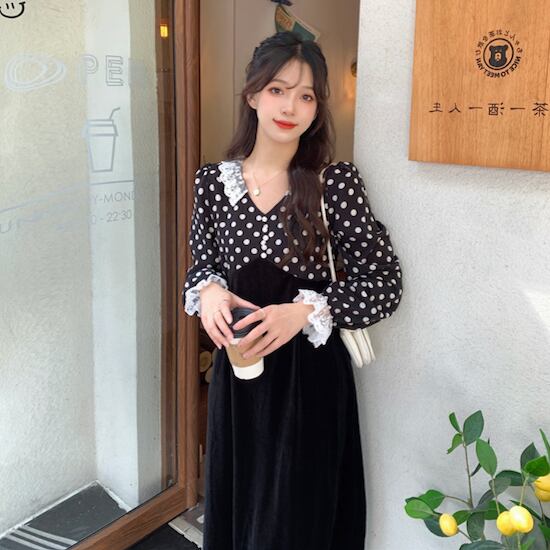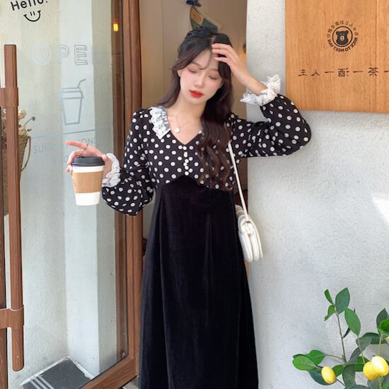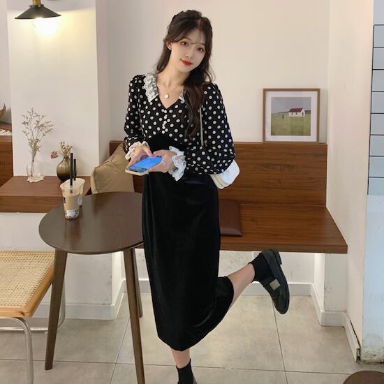 ワンピース ニットドレス レディース ガールズ カジュアル 新作 長袖 プリーツ ベルベット エレガント 通勤 ミディスカート ハーフタートルネック