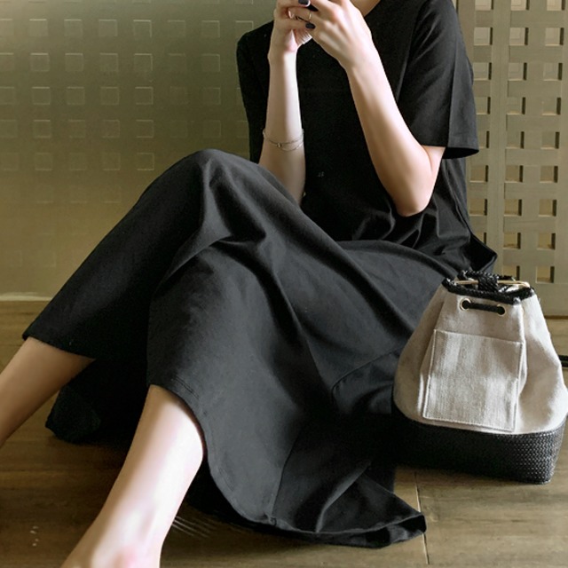 ワンピース レディース ロングワンピース 大きいサイズ 無地 Aラインスカート 夏 コットン ロング丈 ラウンドネック ブラック レッド 紫 半袖 袖あり 10代 20代 大人可愛い デート 女子会