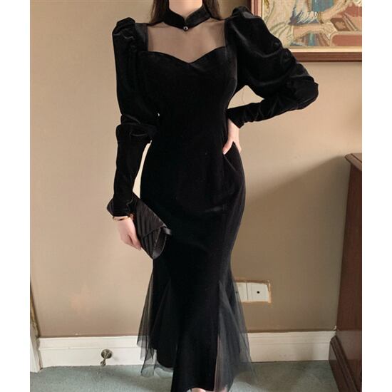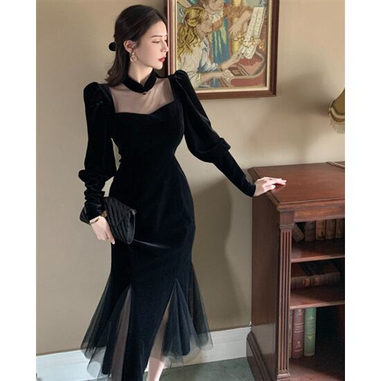 ベルベットドレス パーティドレス チャイナドレス ひざ下丈 長袖 Iライン 刺繍 大きいサイズ レディース エレガント 華やか 上品 発表会 パーティ お呼ばれ