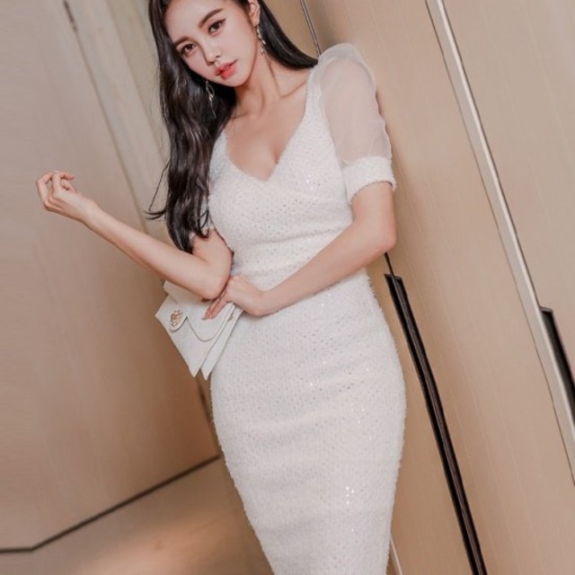 ワンピース ドレス レディース 半袖 シアースリーブ Vネック キラキラ タイトワンピース パーティ お呼ばれ 白 ワンピース ドレス レディース 半袖 すけ感 記念日 夏 シアー袖 ボディコンシャス