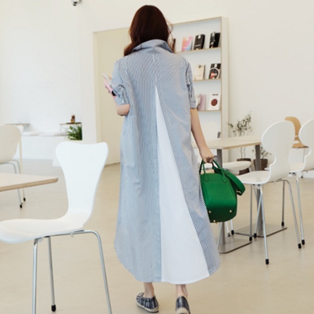 シャツワンピース ロング丈 半袖 フィッシュテール ワンピース ストライプ アシンメトリー 切り替え ゆったり シャツワンピース ロング丈 半袖 フィッシュテール ワンピース ゆったり 大きいサイズ