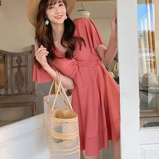 ワンピース レディース 大きいサイズ ステッチ Vネック ロングワンピース ロング丈 フレア Aライン 無地 シンプル ゆったり 大人 上品 きれいめカジュアル 半袖 ポケット付き カジュアル