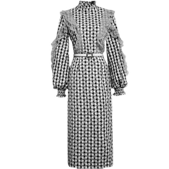 ワンピース ニットドレス レディース ガールズ カジュアル 長袖 千鳥格子 ミディ丈 ミリタリー ハイウエスト 秋冬 あたたか レトロ 襟 セーター