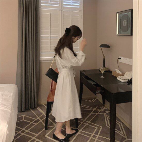 ワンピース ドレス シャツワンピース ホワイト 大きいサイズ Vネック 長袖 春 秋 ウエストマーク 細見え 着痩せ プリーツスカート お呼ばれ パーティー セレブカジュアル セクシー 可愛い