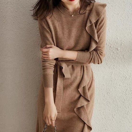 ワンピース ニットドレス レディース ガールズ エレガント 長袖 フリース あったか ミディ丈 秋冬 新作 通勤 キレイ レース ラウンドネック
