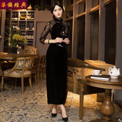 ベルベットドレス パーティドレス チャイナドレス ひざ下丈 長袖 Iライン 刺繍 大きいサイズ レディース エレガント 華やか 上品 発表会 パーティ お呼ばれ