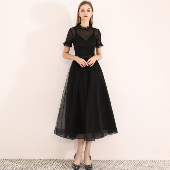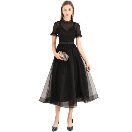 ワンピース ドレス ミドル丈 バイカラー 半袖 袖あり フレンチスリーブ ビーズ刺しゅう モノトーン 星柄 シフォン オーガンジー フレアスカート Aライン フェミニン 発表会 演奏会 大きいサイズ