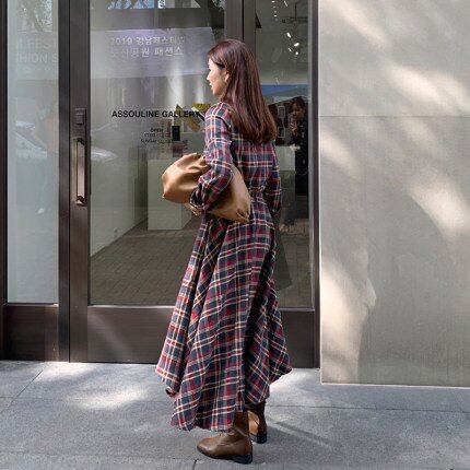 ワンピース ニットドレス レディース ガールズ カジュアル 長袖 千鳥格子 ミディ丈 ミリタリー ハイウエスト 秋冬 あたたか レトロ 襟 セーター