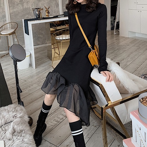 ワンピース ドレス ミドル丈 バイカラー 半袖 袖あり フレンチスリーブ ビーズ刺しゅう モノトーン 星柄 シフォン オーガンジー フレアスカート Aライン フェミニン 発表会 演奏会 大きいサイズ