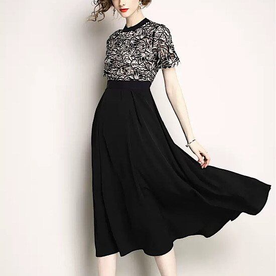 ワンピース ドレス ミドル丈 バイカラー 半袖 袖あり フレンチスリーブ ビーズ刺しゅう モノトーン 星柄 シフォン オーガンジー フレアスカート Aライン フェミニン 発表会 演奏会 大きいサイズ