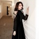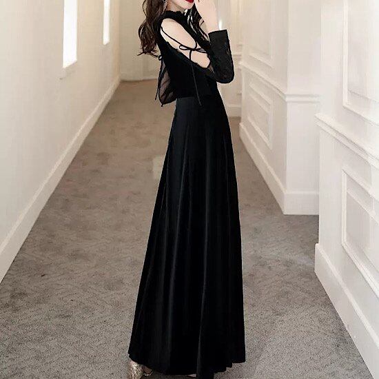 ロングドレス ワンピース くすみピンク マキシ丈 スタンドカラー 長袖 シースルー 透け感 レース パーティードレス 発表会 結婚式 カジュアルドレス 二次会 お呼ばれ