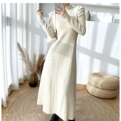 ワンピース ニットドレス レディース ガールズ エレガント 長袖 フリース あったか ミディ丈 秋冬 新作 通勤 キレイ レース ラウンドネック