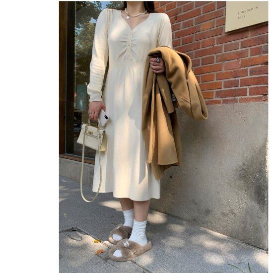 ワンピース ニットドレス レディース ガールズ エレガント 長袖 フリース あったか ミディ丈 秋冬 新作 通勤 キレイ レース ラウンドネック